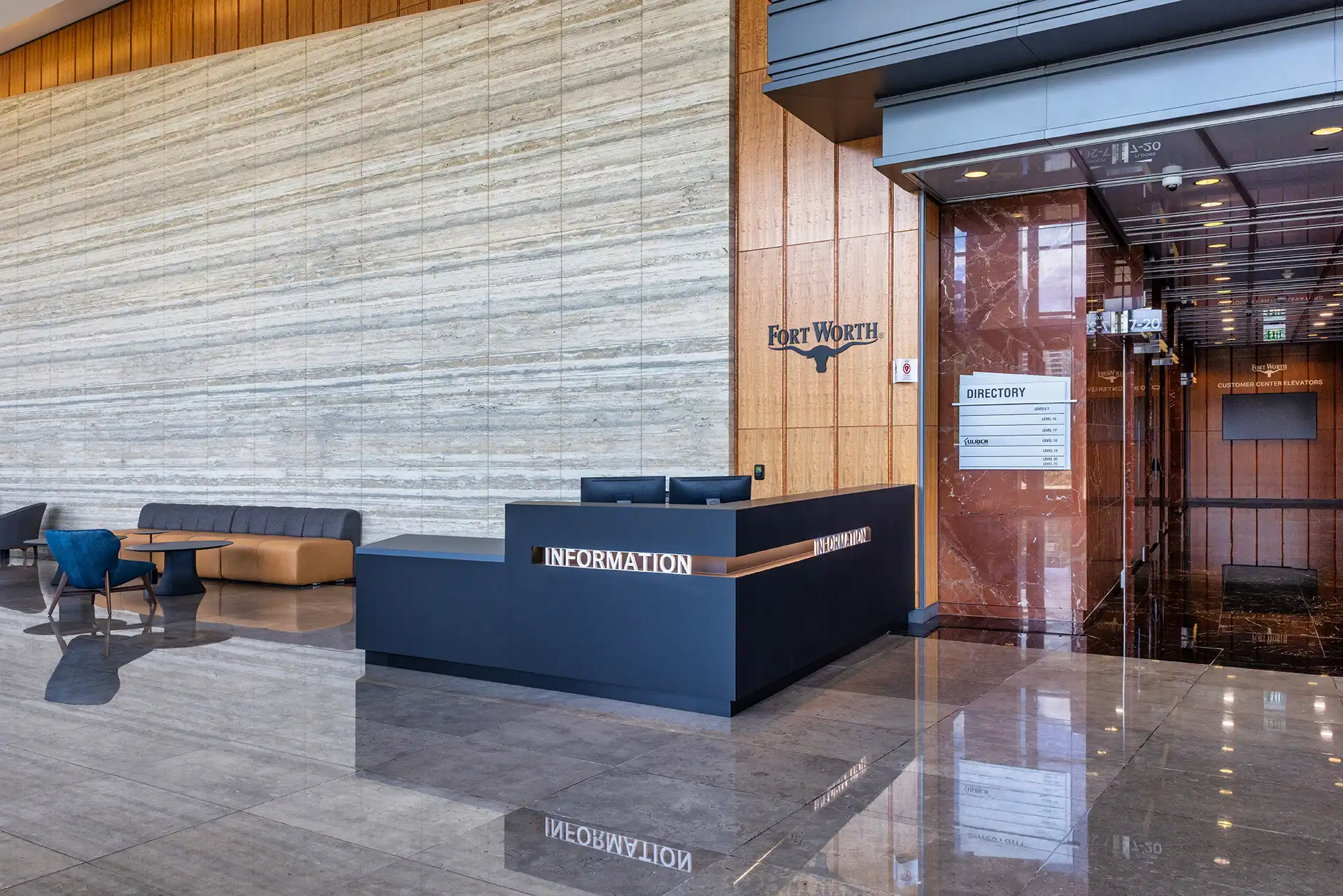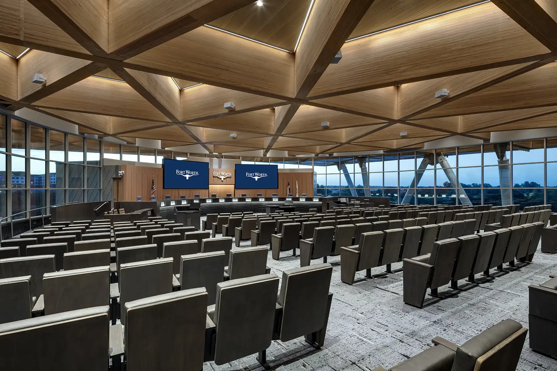 Fashioned out of the former Pier 1 Imports Corporate Headquarters, New City Hall was the result of a major renovation and expansion project for the City of Fort Worth. Renovations were reserved for the existing tower, which now contain flexible floor plans for more than 23 city departments and more than 1,000 employees. The expansion was dedicated to building a new Council Chambers building—an intricately designed facility equipped with theater-style seating for 244, sound amplification capacities, broadcast capabilities, and interactive software displays at each of the city council seats. The two-story lobby includes a media room and workroom for all to use prior to council meetings. Along with the renovated tower and new Council Chambers, the project also called for a reconfigured parking garage to accommodate the more than 1,400 staff and visitors, and introduced new outdoor spaces to create a more welcoming, pedestrian-friendly environment.
